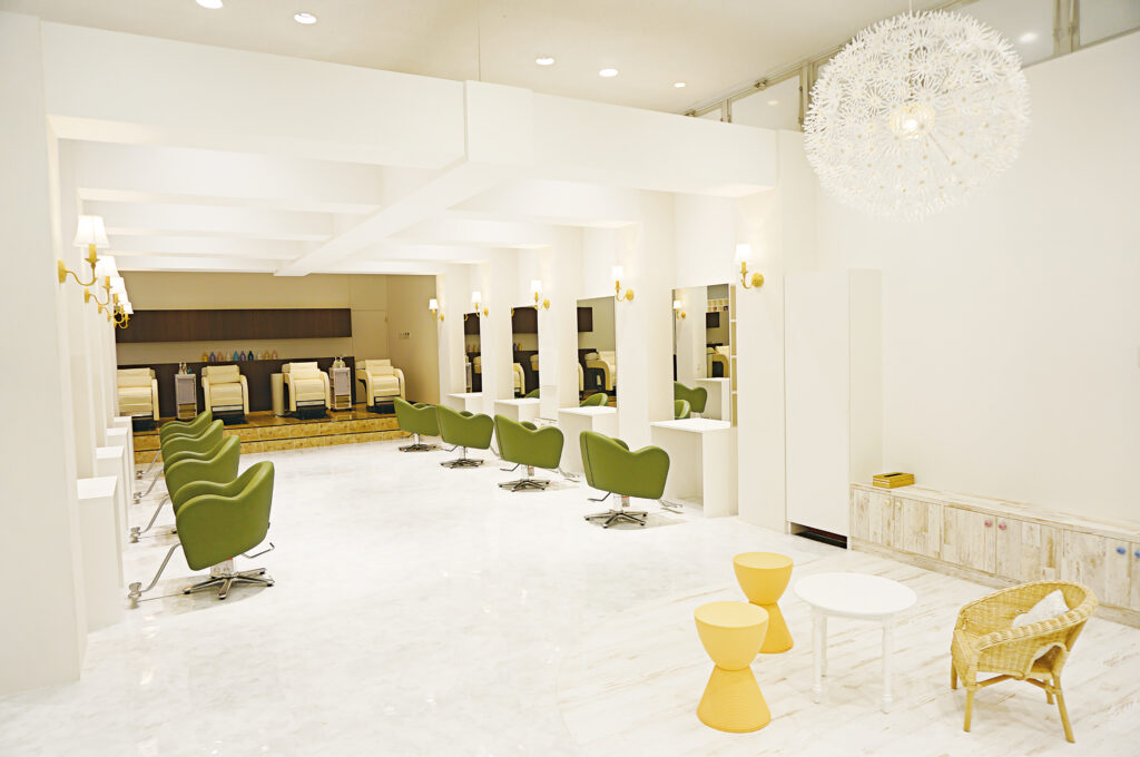 白を基調とした明るい店内では、ネイル・まつげパーマ・メイク・コスメ販売など、